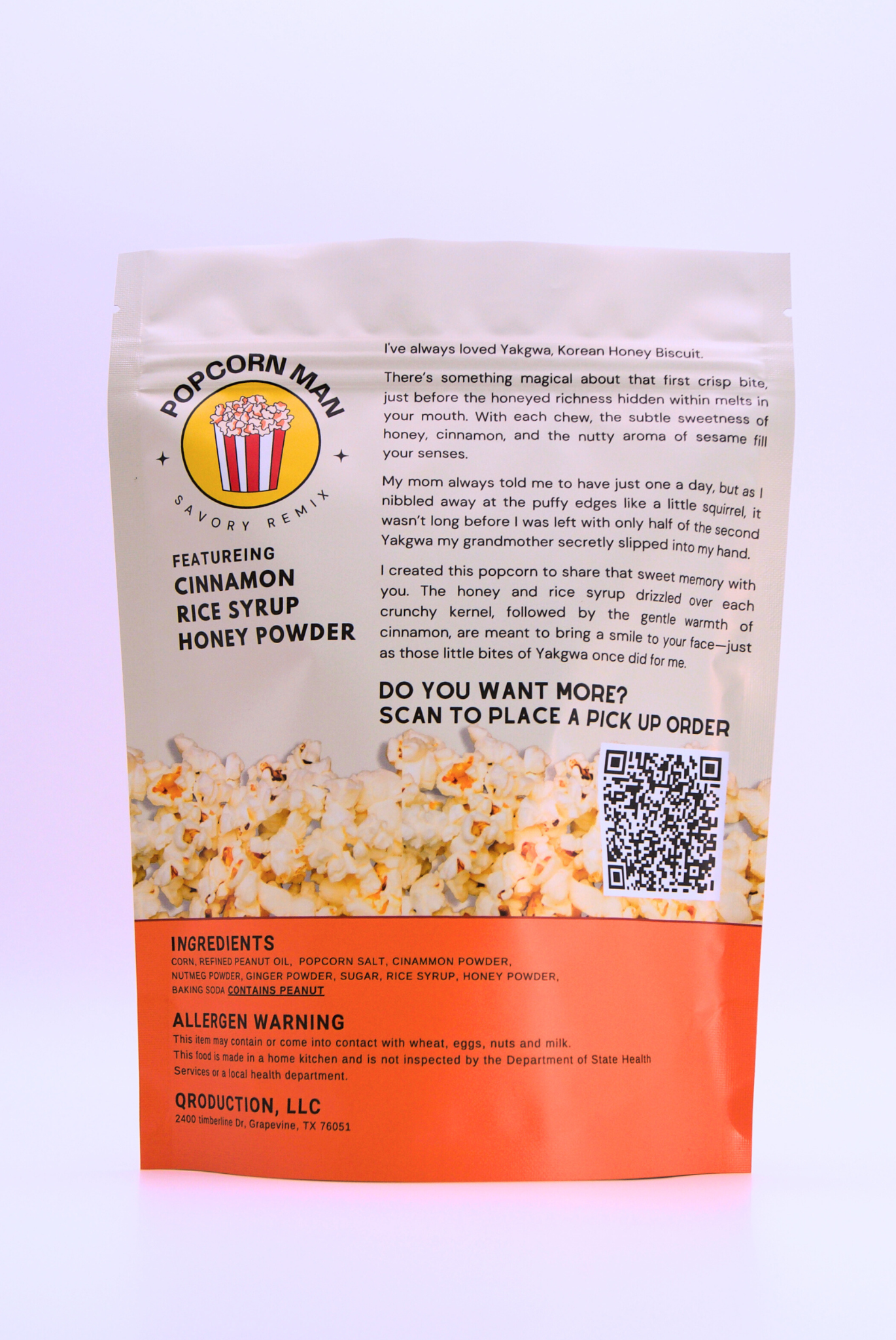 We make it the traditional way: using rice syrup instead of corn syrup, just like real yakgwa. Each batch is mixed into a buttery honey-caramel coating and then baked a second time to gently pull out moisture, giving the popcorn that signature light, crisp crunch.